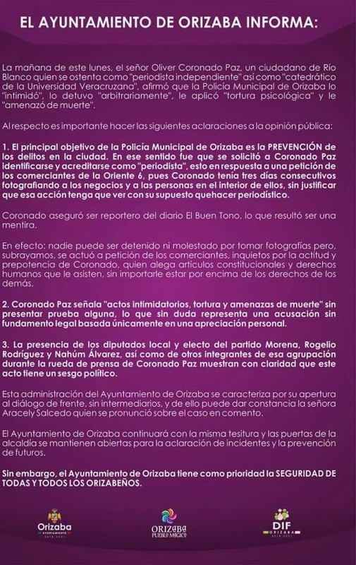 “Deseamos expresar nuestro enérgico rechazo y repudio a los actos de prepotencia, abuso de autoridad, privación de la libertad y amenazas de muerte de las que fue objeto en nuestro compañero y colaborador Oliver Coronado paz por parte de elementos de la Policía Municipal de Orizaba y del director de Gobernación de Orizaba reconociendo que son una falta gravísima a sus derechos. Asimismo quiero expresar la preocupación de todo el colectivo y la mía propia surgida a raíz del mensaje intimidatorio que el señor Juan Ramón Herebia manda una servidora Araceli Salcedo Jiménez, en la persona de Oliver mientras lo tuvo retenido contra su voluntad durante la serie de amenazas que le lanzó. El cómo servidor público en el momento que me llegue a citar legalmente acudiré y no necesita enviar un mensaje con nadie. Demandamos finalmente a la primera autoridad municipal garantiza que los recursos tecnológicos de seguridad en los que el ayuntamiento de Orizaba ha intervenido el dinero de los orizabeños sean administrados por personal honesto y confiable para brindar protección a los ciudadanos y no para la intimidación de los pobladores ni para acechar a defensores de Derechos Humanos”.