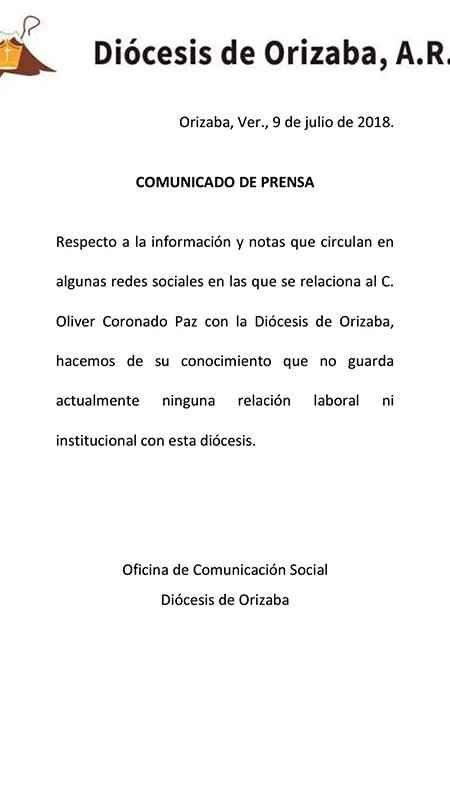 Oliver Coronado Paz con la Diócesis de Orizaba, hacemos de su conocimiento que no guarda actualmente ninguna relación laboral ni institucional con esta diócesis”. Firmo la oficina de Comunicación Social de la Diócesis de Orizaba