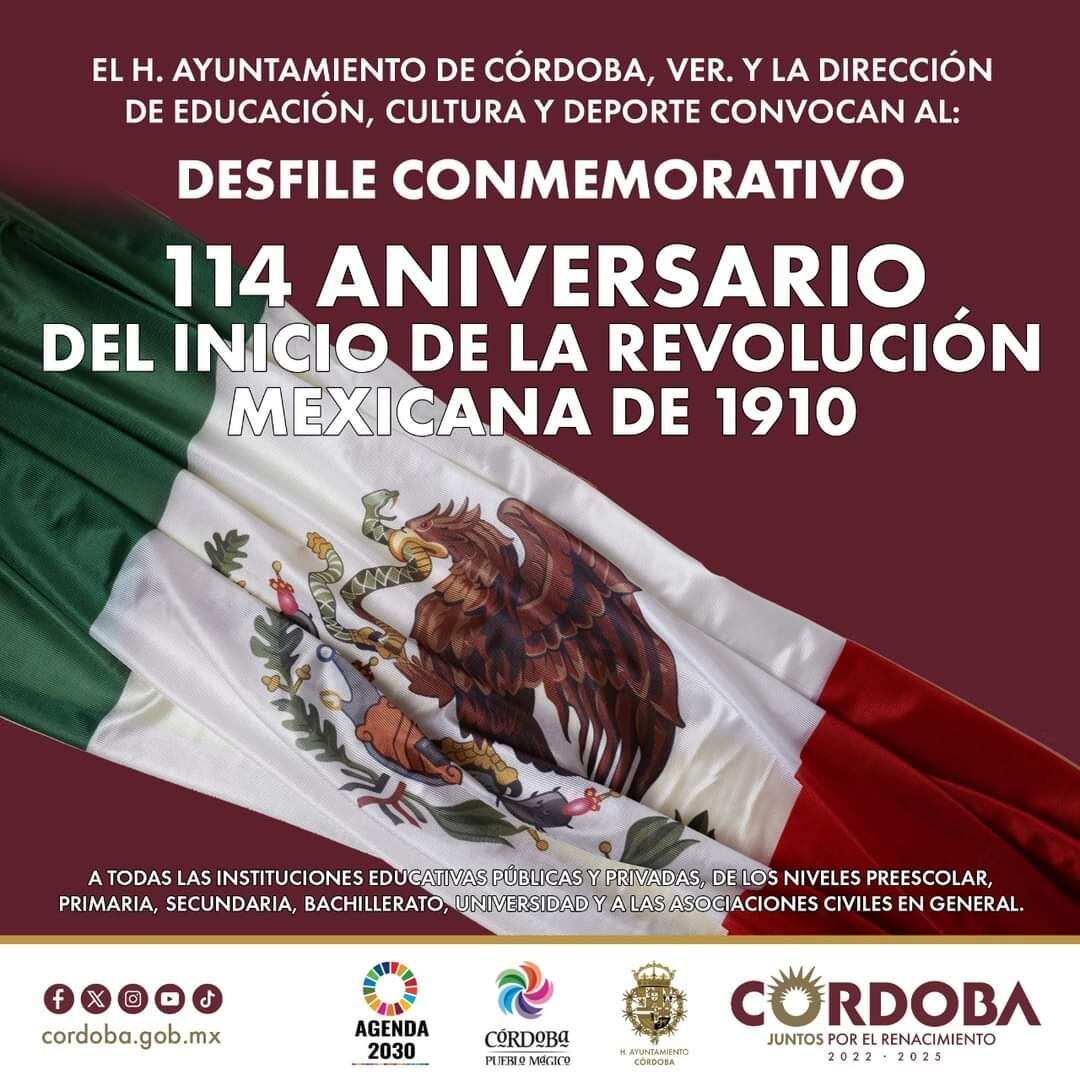 Córdoba, Ver.- La Dirección de Educación, Cultura y Deporte publicó la convocatoria dirigida a todas las instituciones educativas públicas y privadas de los niveles preescolar, primaria, secundaria, bachillerato, universidad y las asociaciones civiles en general para participar en el Desfile Cívico Deportivo con motivo del 114 Aniversario del inicio de la Revolución Mexicana.