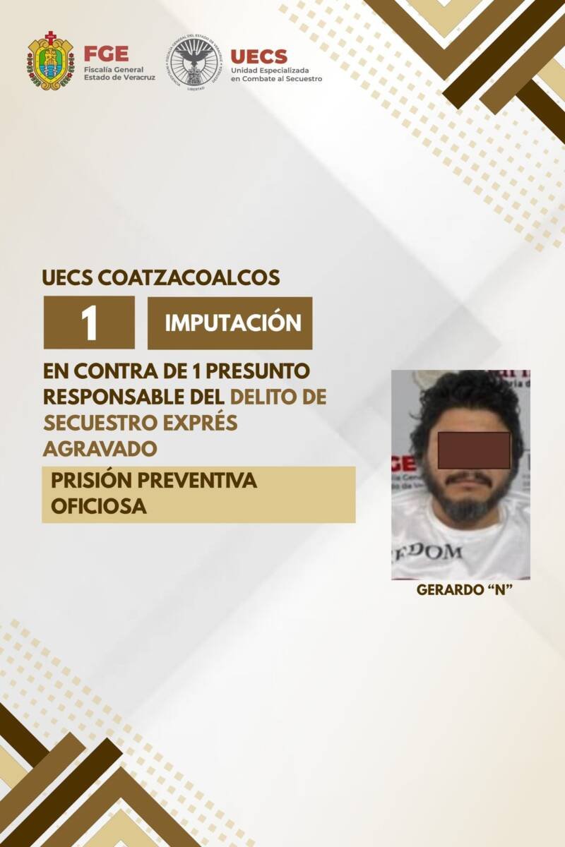 En otra acción, en 𝗖𝗼𝗮𝘁𝘇𝗮𝗰𝗼𝗮𝗹𝗰𝗼𝘀 se formuló la imputación ante la autoridad judicial en contra de 𝗚𝗲𝗿𝗮𝗿𝗱𝗼 “𝗡”, como presunto responsable del delito de 𝘀𝗲𝗰𝘂𝗲𝘀𝘁𝗿𝗼 𝗲𝘅𝗽𝗿𝗲́𝘀 𝗮𝗴𝗿𝗮𝘃𝗮𝗱𝗼.