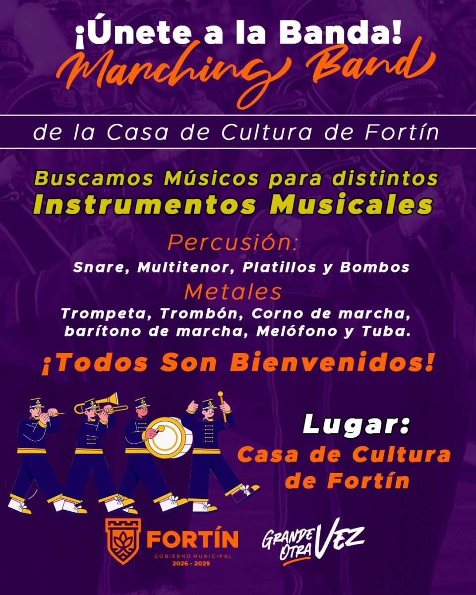 Con el firme propósito de fortalecer la identidad cultural y ofrecer alternativas de desarrollo artístico para la juventud, el Ayuntamiento de Fortín, a través de la Coordinación de Cultura y Bibliotecas, abrió la convocatoria para las personas interesadas en conformar la Marching Band oficial del municipio.