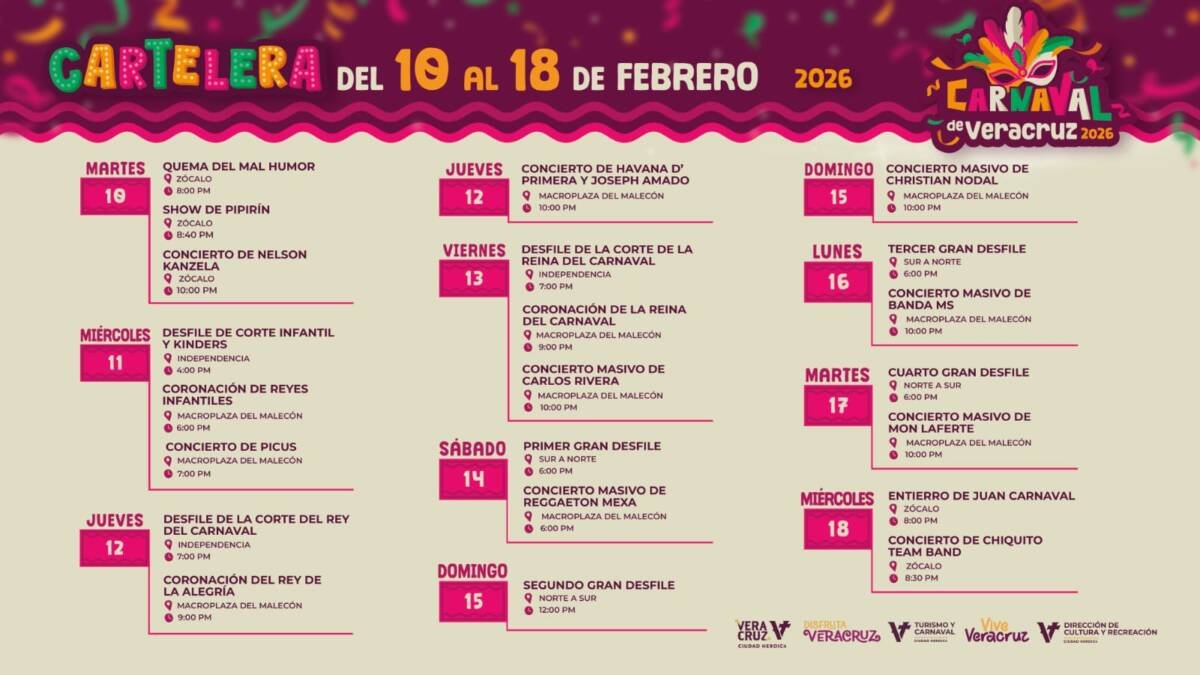 Del 10 al 18 de febrero, la ciudad de Veracruz se llena de color, música y tradición con las coronaciones, desfiles emblemáticos y grandes espectáculos en el Zócalo y la Macroplaza del Malecón.