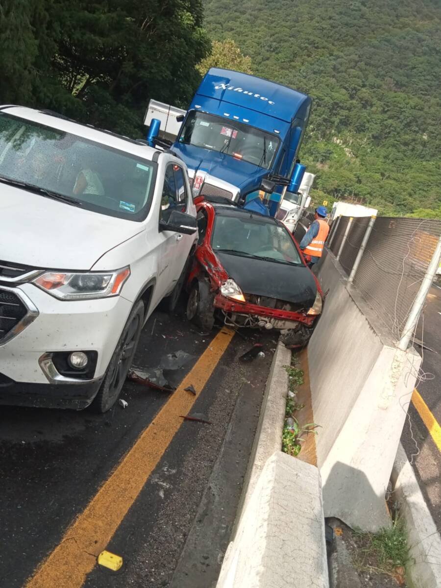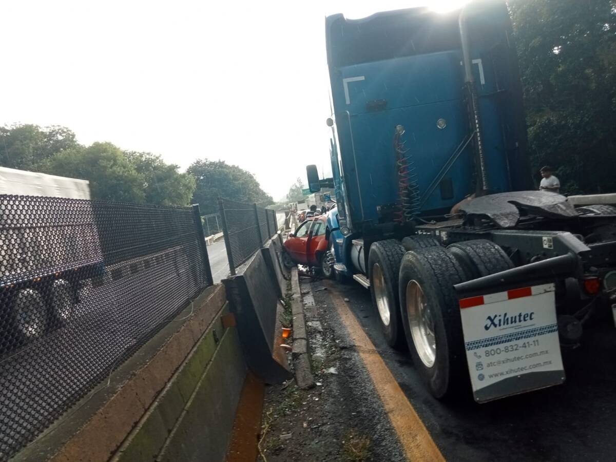 El percance, registrado minutos antes de las 18:00 horas en el kilómetro 264+600, involucró a tres unidades: una camioneta blanca, un automóvil compacto Chevrolet Chevy de color rojo con negro y un tractocamión Kenworth de color azul con razón social Xihutec.