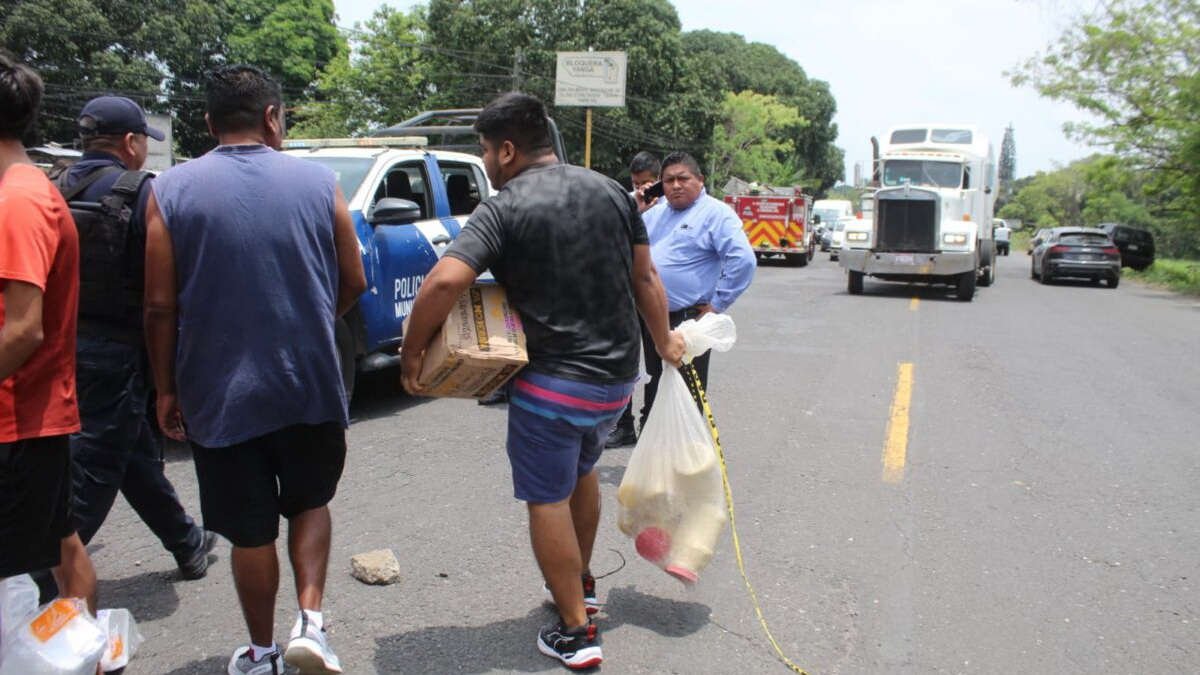 Tras el accidente policías de Yanga resguardaron el área en espera de la llegada de la Fiscalía Regional pero pobladores de los alrededores no esperaron y saquearon el camión cargado de abarrotes que fueron robados y disputados por la gente.