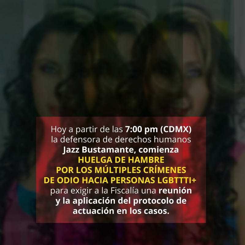 Veracruz, Ver.- Luego del reciente asesinato de una mujer transexual en el municipio de Puente Nacional, la activista y representante del Observatorio Nacional de Crímenes de Odio, Jazz Bustamante, dijo que iniciará una huelga de hambre, hasta que la Fiscalía General del Estado de seguimiento a la mesa interinstitucional y se reúna con representantes de la comunidad LGBTTI.