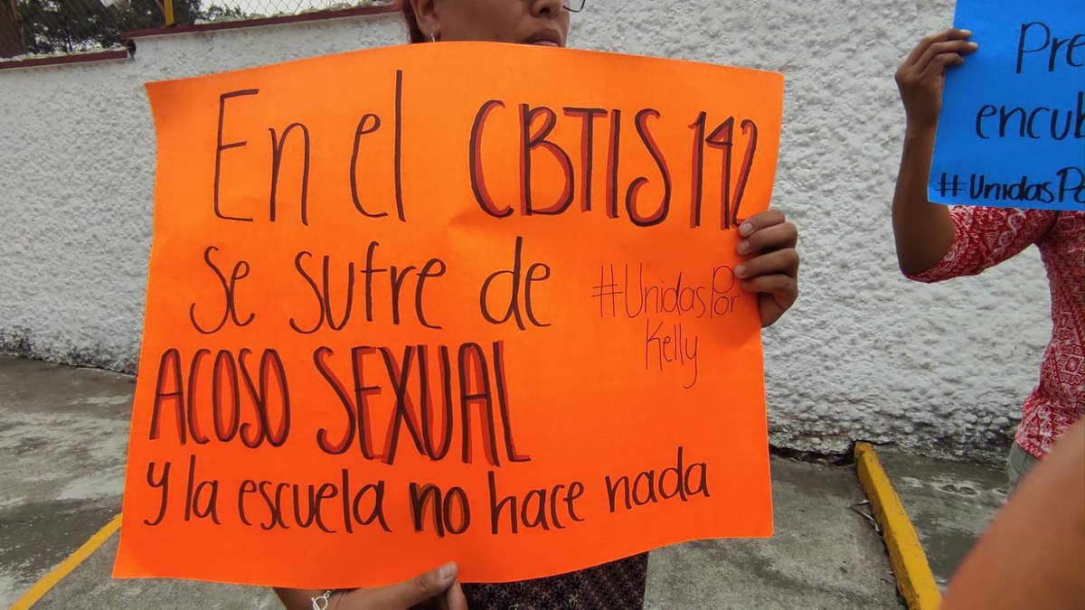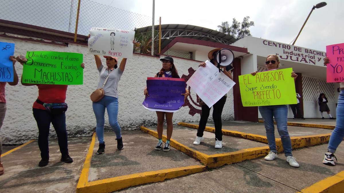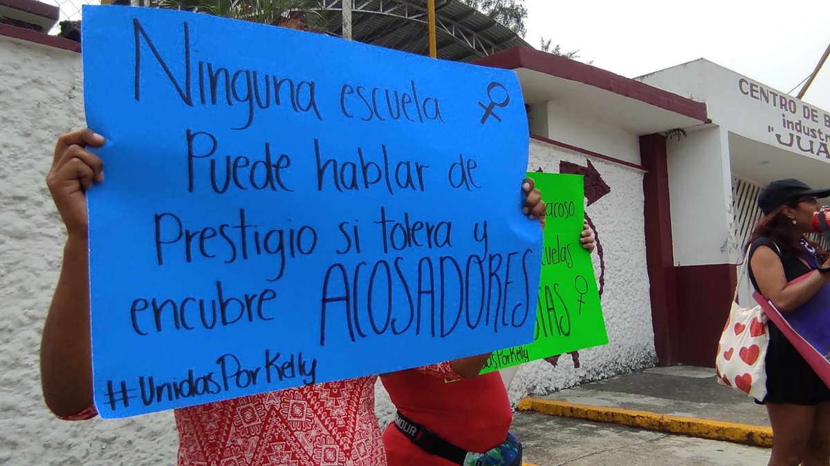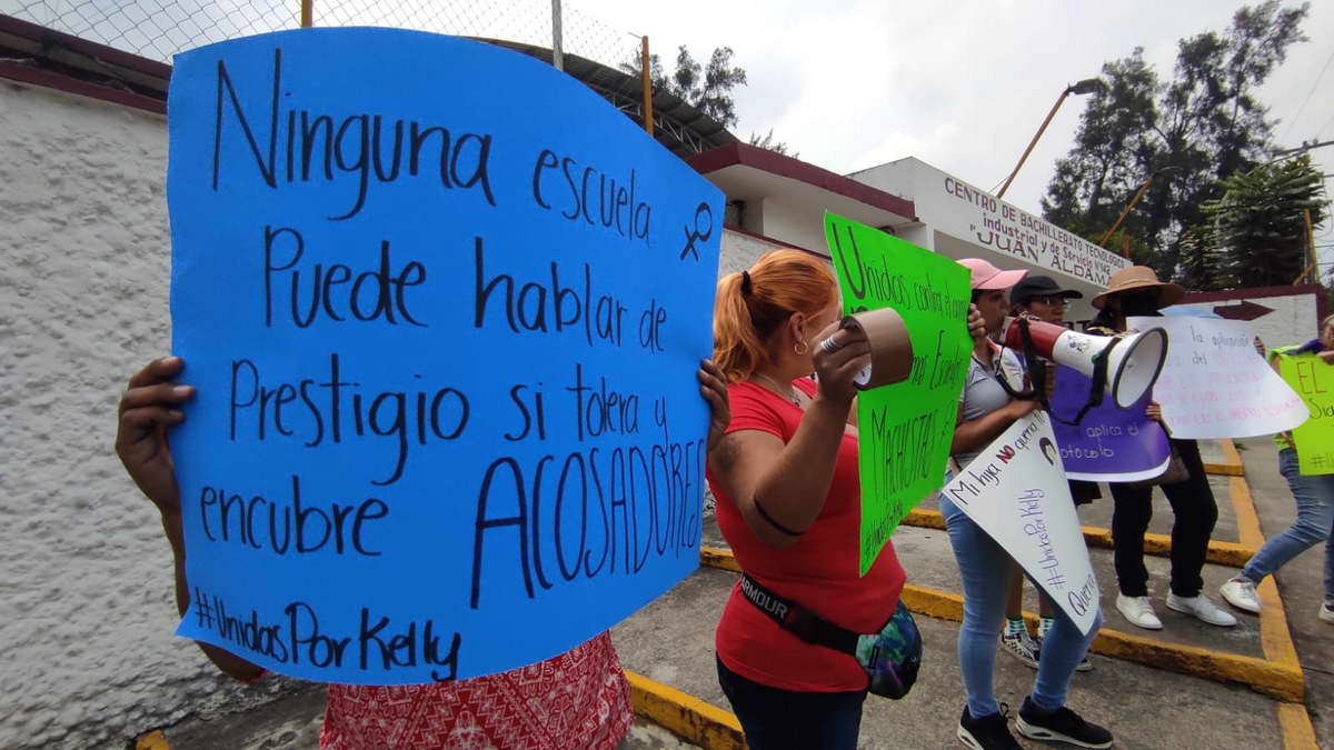 Con pancartas la mujer expuso que desde septiembre del 2022 a una semana de iniciadas las clases, su hija sufrió acoso sexual por parte del prefecto de esta institución, sin embargo y a pesar de hacer de conocimiento de la directora Alicia Barcelata esta situación, el agresor sigue en su puesto de trabajo.