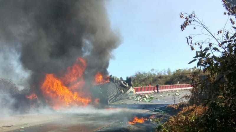 Maltrata, Ver.- El cierre total de la autopista en el tramo de las Cumbres de Maltrata provocó el incendio de un trailer que transportaba cajas con bebidas energizantes.