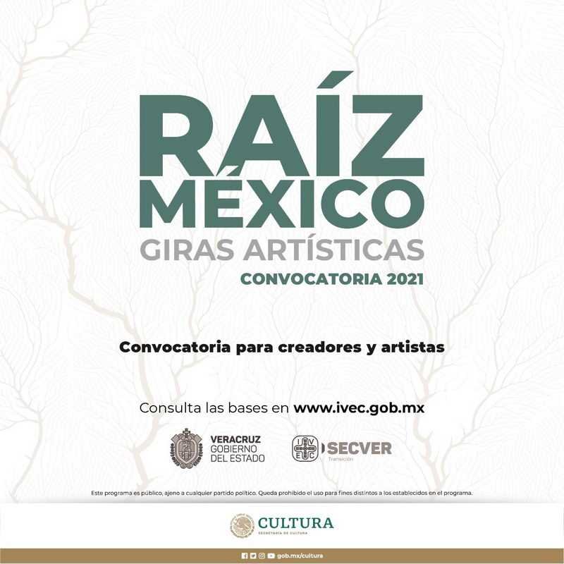 La Secretaría de Cultura federal, a través del Festival Internacional Cervantino y Circuitos Culturales, como parte del programa Bosque de Chapultepec: Naturaleza y Cultura, en coordinación con el Instituto Veracruzano de la Cultura te invitan a participar en la convocatoria Raíz México: giras artísticas.
