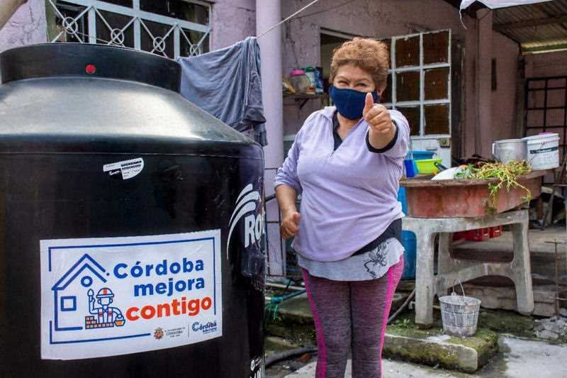 En respuesta a una petición ciudadana recibida a través de la plataforma Miércoles Contigo, el Ayuntamiento de Córdoba realizó la entrega de un tinaco captador de agua pluvial a la señora Josefina Ortega, vecina de la colonia Arrayanes.