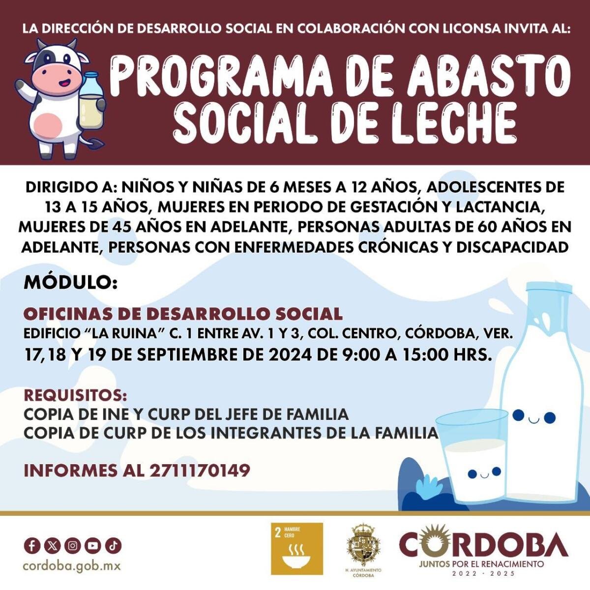 H. Córdoba Ver. a 18 de septiembre de 2024.- Con la finalidad de contribuir al apoyo en las finanzas de las familias cordobesas, el Ayuntamiento de Córdoba que preside Juan Martínez Flores, a través de la dirección de Desarrollo Social, en colaboración con Liconsa, invitan a la ciudadanía para que se beneficien con el programa de Abasto Social de Leche.