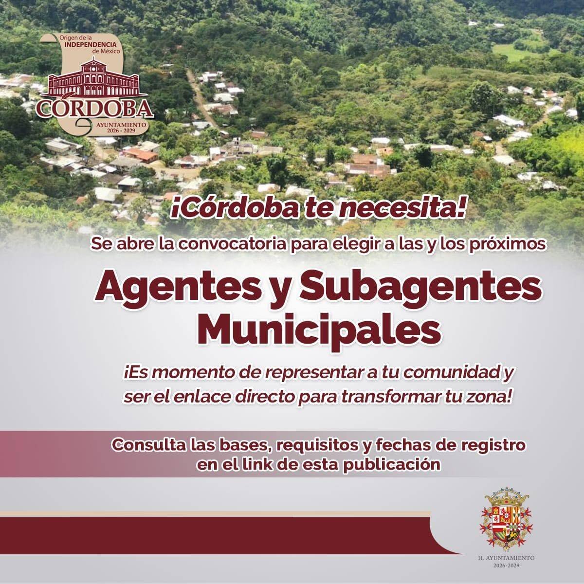 Córdoba, Ver., 26 de febrero de 2026. – El Ayuntamiento de Córdoba ha publicado la convocatoria oficial para la elección de Agentes y Subagentes municipales para el período 2026-30; se trata de un ejercicio que fortalece la democracia en las comunidades, por lo que las y los ciudadanos interesados tendrán del 02 al 06 de marzo para registrar sus respectivas candidaturas.