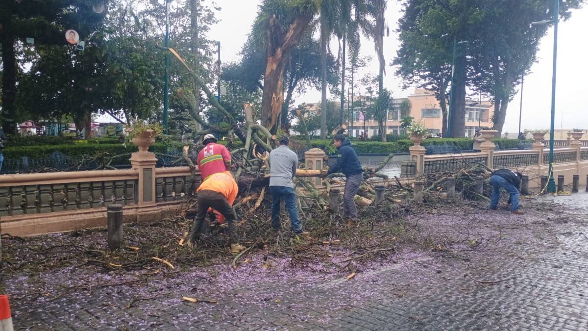 La mañana de este martes la rama de una jacaranda cayó en el parque Juárez, dañando el barandal de este céntrico espacio, frente al palacio municipal, sin causar lesionados, solo dos taxis resultaron levemente afectados.