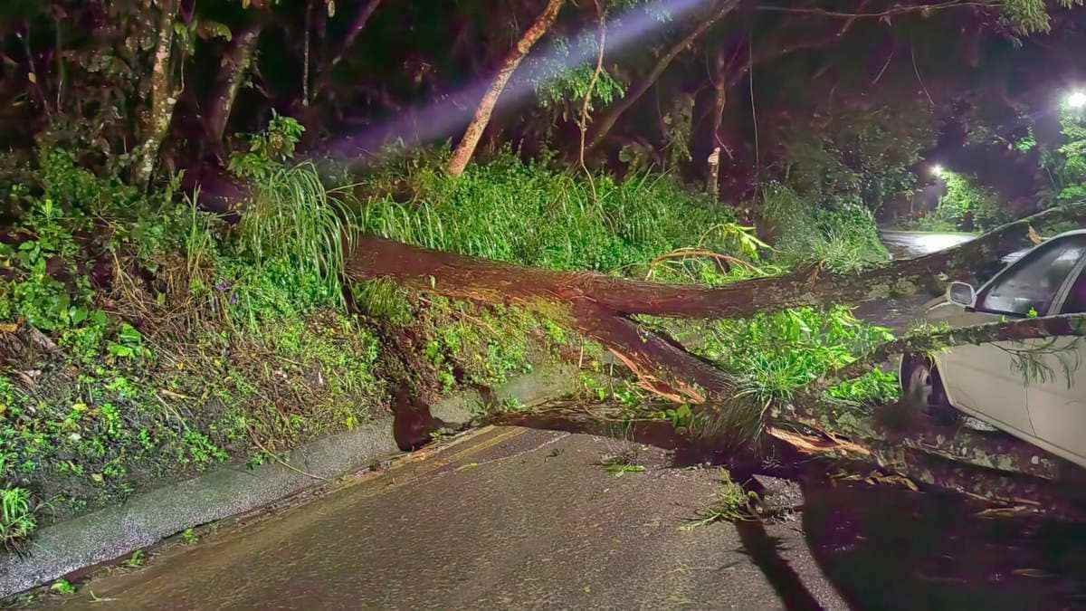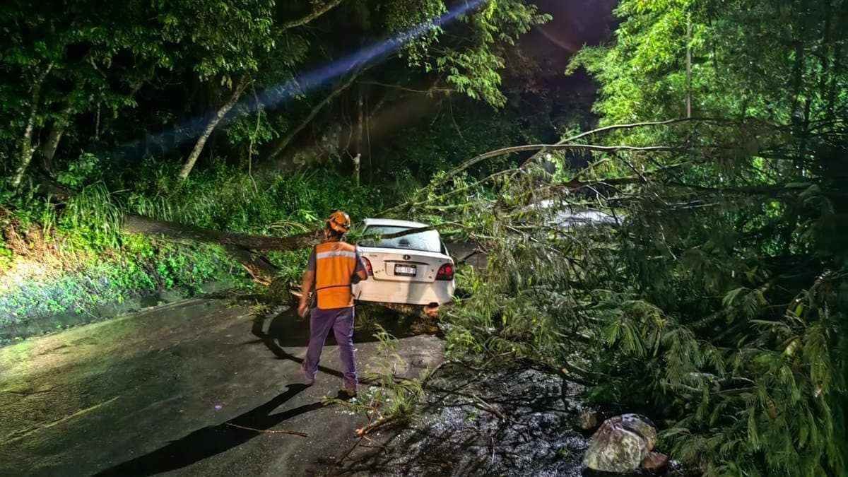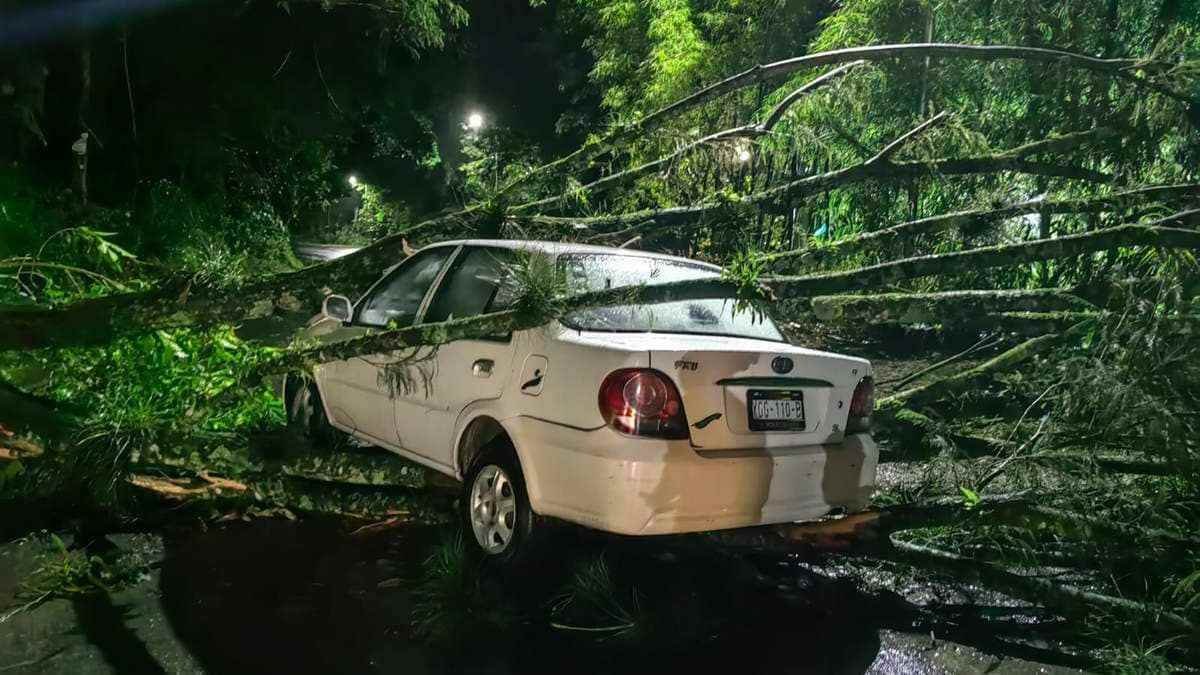 Ixtaczoquitlán, Ver.- Las fuertes lluvias de los últimos días provocaron que un árbol al pie de la carretera federal se desplomara cayendo sobre un automóvil que circulaba en el tramo Fortín-Cuautlapan-Carta Blanca