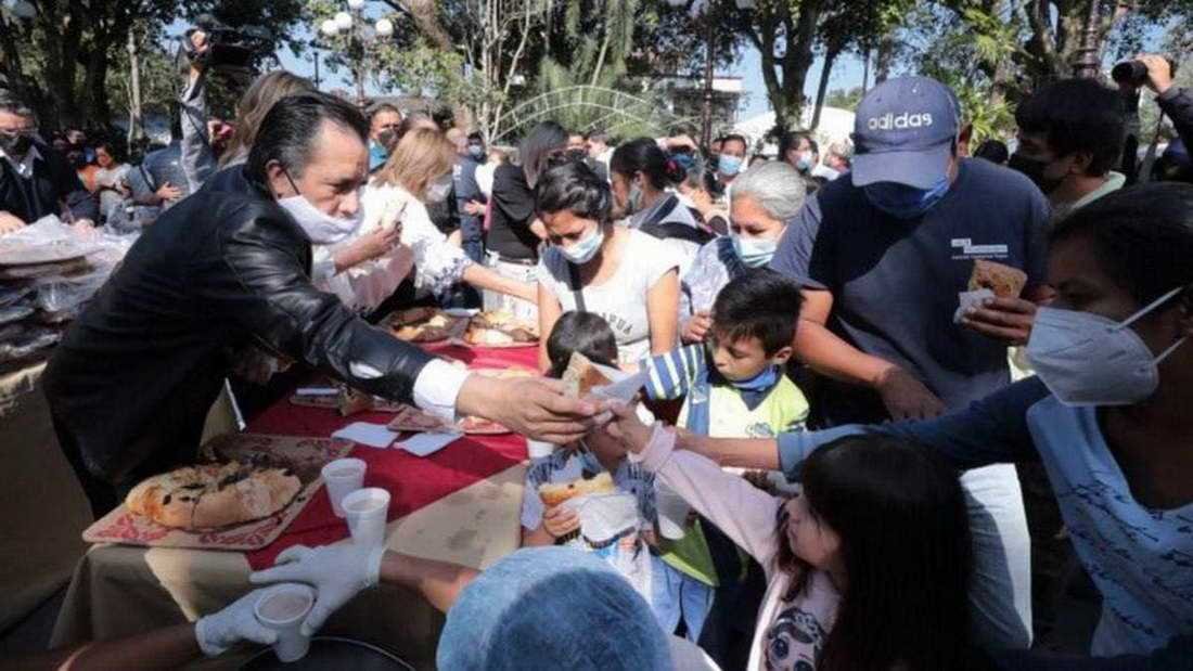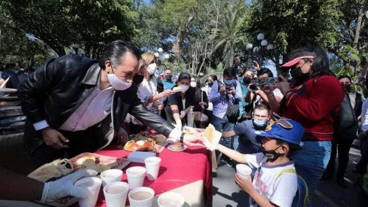 Acompañado por la presidenta del DIF Estatal, Rebeca Quintanar Barceló, y el secretario de gobierno, Eric Cisneros Burgos, el mandatario partió la tradicional rosca de reyes y personalmente la repartió entre los presentes, además de un rico chocolate caliente.