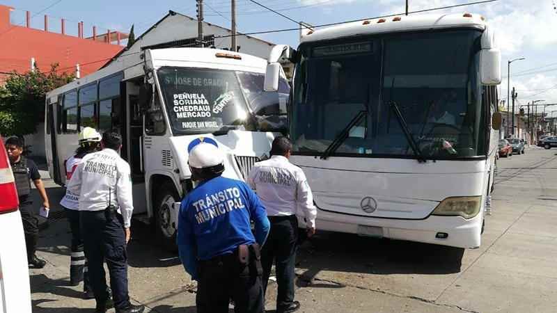 Seis lesionados, daños materiales por 20 mil pesos y bloqueo total de la vialidad fue el saldo de un choque entre dos unidades de pasaje en la avenida 2 y calle 21 de la colonia centro.