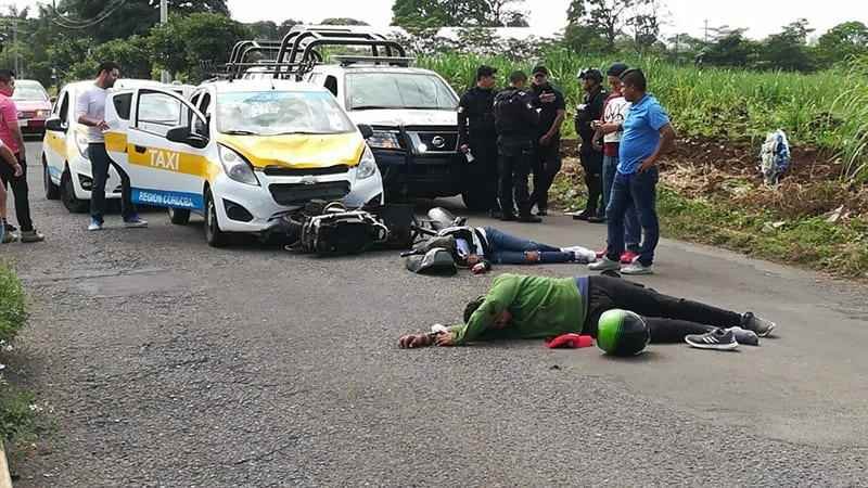 Córdoba, Ver.- La tarde de este domingo dos jóvenes motociclistas que circulaban a un costado de la aeropista Juan Antonio Perdomo Díaz, chocaron de manera frontal contra una unidad de alquiler de la ciudad de Córdoba con número económico, CO—2161, resultando gravemente lesionados y fueron llevados a un hospital para su atención médica.