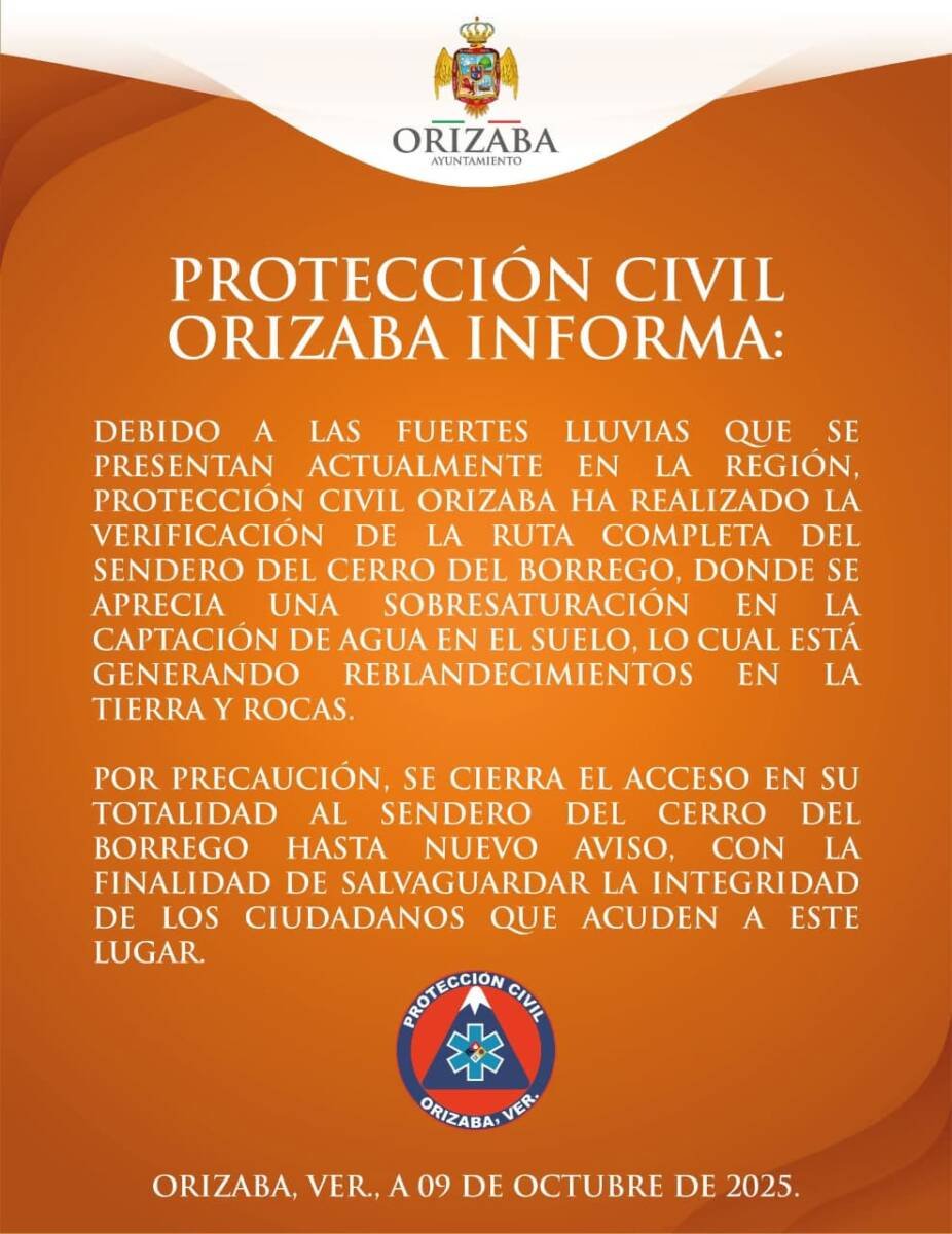 Por ello el Ayuntamiento de Orizaba, en coordinación con Protección Civil, determinó restringir por completo el acceso al público como una medida precautoria, cierre que se mantendrá hasta nuevo aviso, mientras se realizan evaluaciones técnicas y un monitoreo constante para determinar cuándo el área recupera condiciones de seguridad plenas.