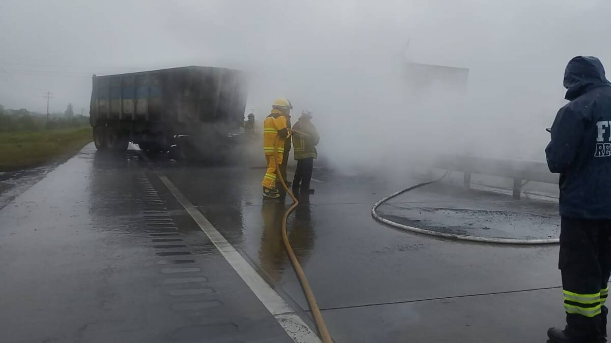 En Ciudad Mendoza, en la zona conocida como La Curva del Pocito, otra unidad de carga fue quemada y quedó atravesada sobre la carpeta asfáltica.