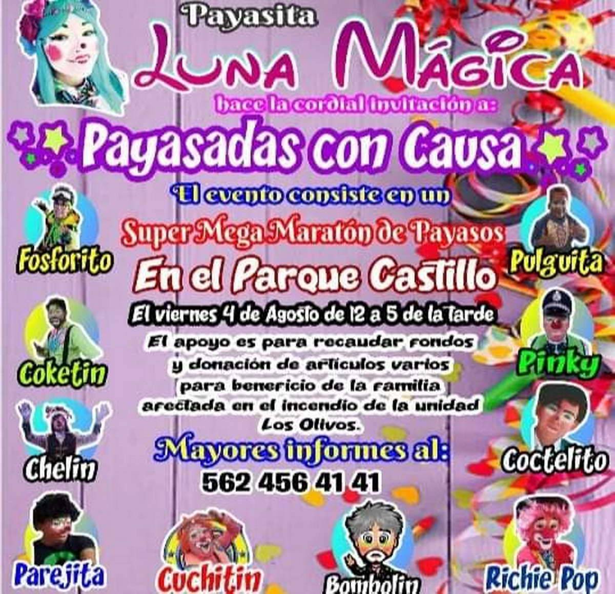 Sobre el evento dijo, se planeó hacer esta edición el próximo viernes 4 de agosto a partir de las 12 horas y hasta las 17 horas en el parque “Apolinar Castillo”, en donde 12 payasitos estarán ofreciendo un show, mientras las personas pueden aportar su apoyo a través de artículos para el hogar, ya que la familia perdió todas sus posesiones en el incendio, también pueden llevar artículos de despensa o alguna ayuda económica.