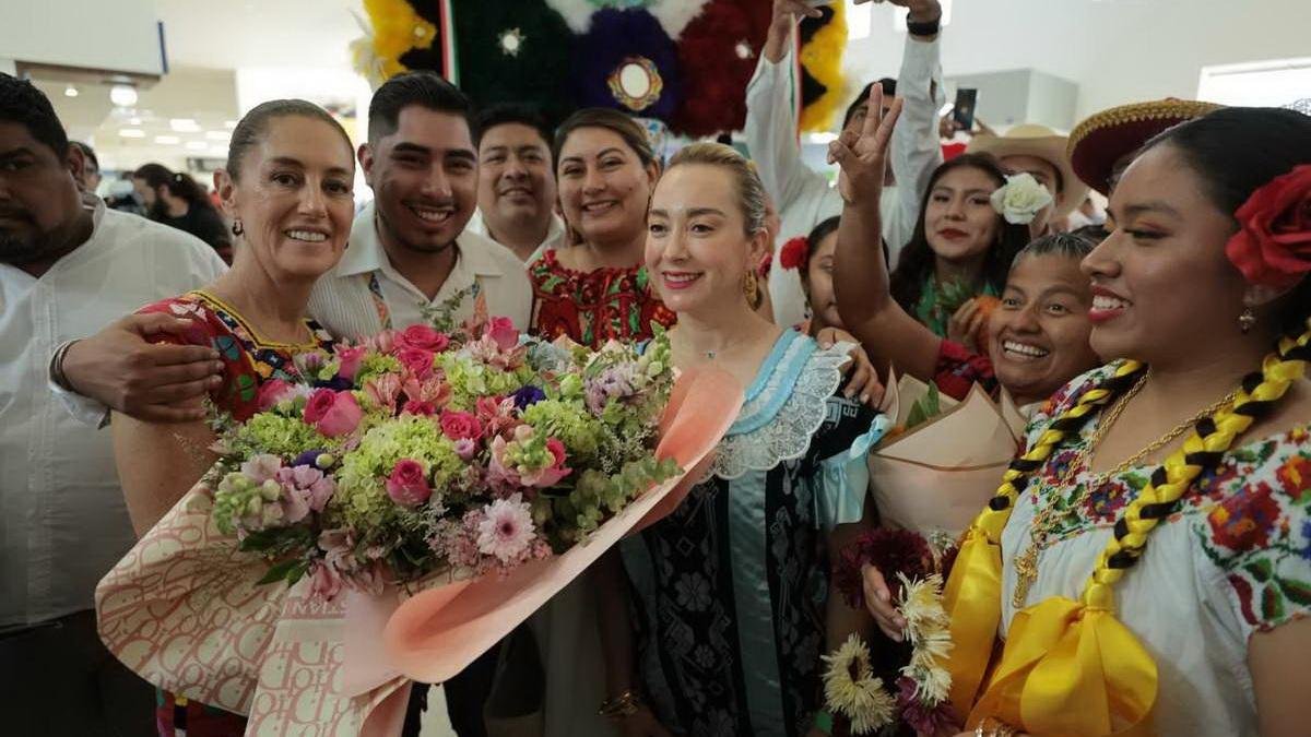 Oaxaca de Juárez, Oaxaca a 24 de septiembre de 2023.- Este domingo, Claudia Sheinbaum fue recibida en Oaxaca, por el gobernador Salomón Jara Cruz, así como por la alegría de los simpatizantes de la entidad, entre quienes se destacó un grupo de mujeres que portaban el tradicional traje de tehuana y quienes aprovecharon para darle la bienvenida con un arreglo floral.