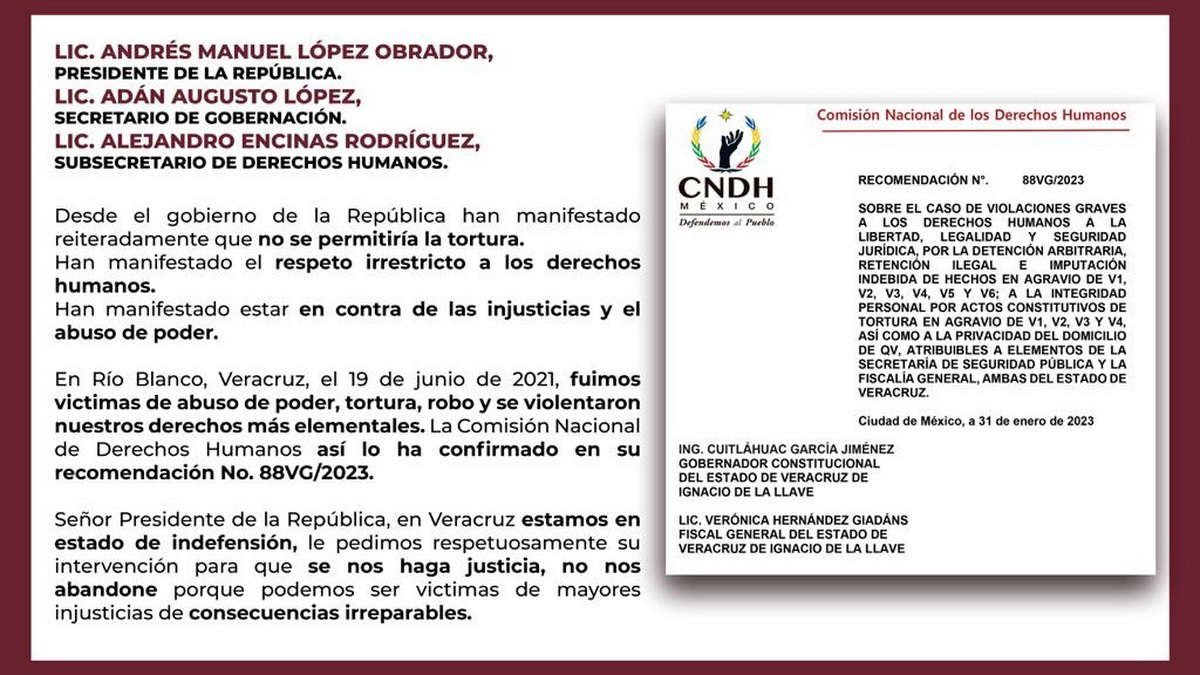 Han manifestado estar en contra de las injusticias y el abuso de poder. En Río Blanco, Veracruz, el 19 de junio de 2021, fuimos victimas de abuso de poder, tortura, robo y se violentaron nuestros derechos más elementales”.