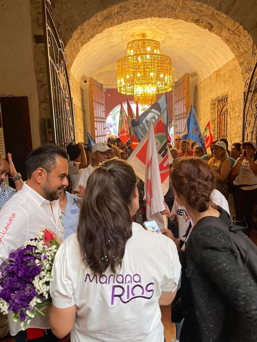 La abanderada el PAN, PRI y PRD fue recibida al final del debate por porras y muestras de apoyo por parte de simpatizantes de los partidos de la coalición, encabezados por sus presidente del partido, además de familia, amigos y ciudadanos que se sumaron a este triunfo de Mariana Ríos.