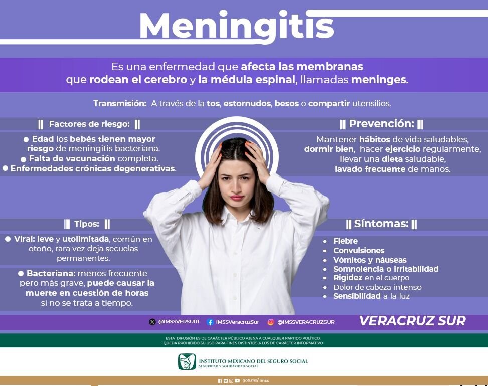 El Instituto Mexicano del Seguro Social (IMSS) en Veracruz Sur informa a la población general sobre la Meningitis, enfermedad considerada altamente peligrosa para los niños, la cual de no tratarse a tiempo puede causar graves problemas a la salud, discapacidad y hasta la muerte.