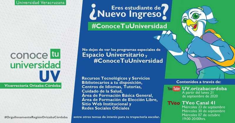 Orizaba, Ver.- A partir de este lunes 21 de septiembre, la Universidad Veracruzana (UV) dará la bienvenida a sus estudiantes de nuevo ingreso, en esta ocasión de manera virtual a través del programa #ConoceTuUniversidad.