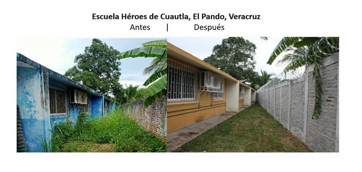 A partir del dialogo con las comunidades vecinas a Constellation Brands en Veracruz, se llevaron a cabo talleres para definir las inquietudes y necesidades comunitarias. En este primer proceso, se le dio mayor prioridad a la mejora de la Escuela Héroes de Cuautla, en El Pando, y a la Escuela Francisco Montoya, Paso San Juan, Veracruz y se estableció un plan de mejoramiento de infraestructura que incluyeron actividades como: la reinstalación del sistema eléctrico; impermeabilización de muros y techos en general; pintura en general; revisión y reparación de equipos HVAC; supervisión estructural y reparación de bardas perimetrales; colocación de techumbres; y juegos de piso para uso de la comunidad estudiantil.