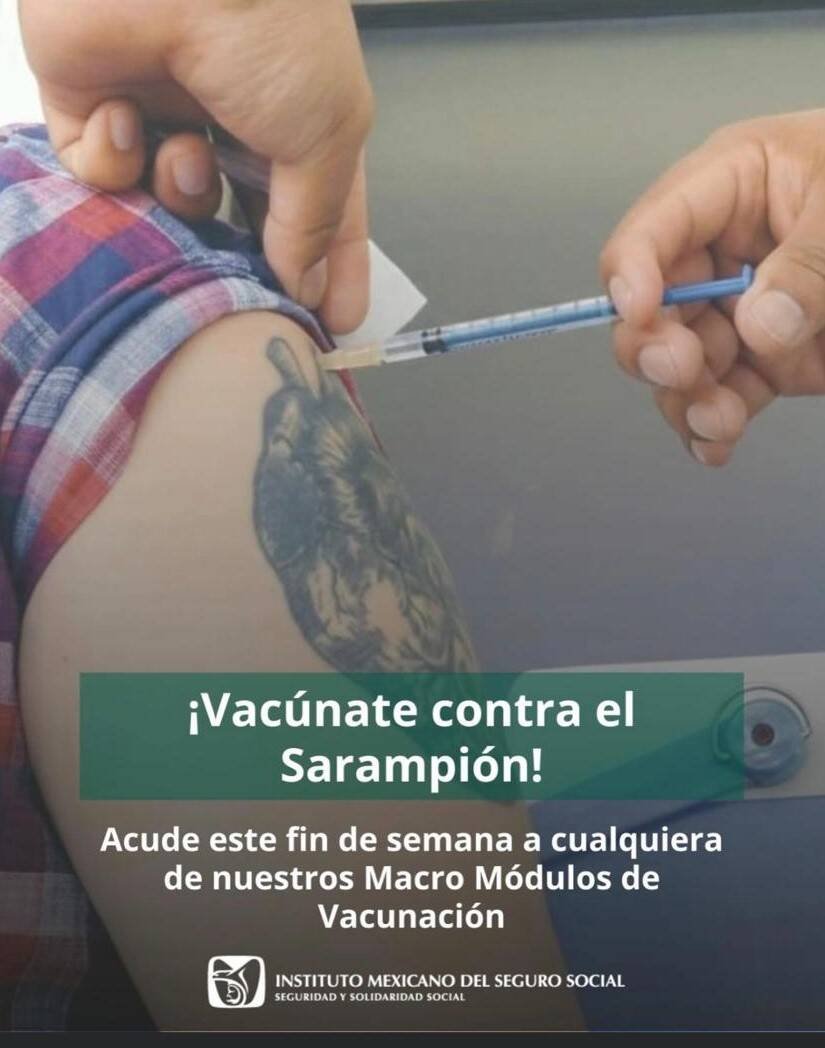 El Instituto Mexicano del Seguro Social (IMSS) en Veracruz Sur informa que este fin de semana continuará la Jornada de Vacunación en hospitales y Unidades de Medicina Familiar, en un horario de 8:00 a 20:00 horas, con el objetivo de reforzar la protección contra el sarampión, además de hacer el llamado a la población a fortalecer las medidas de prevención ante esta enfermedad altamente contagiosa.