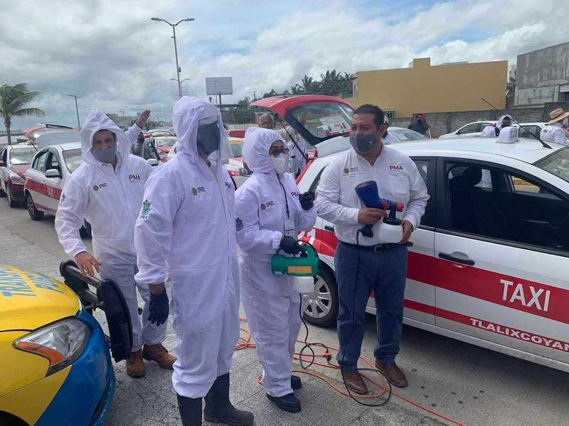 Boca del Río, Ver.- Siguiendo las indicaciones del gobernador de Veracruz, Cuitláhuac García Jiménez y con la finalidad de disminuir la transmisión del Covid-19, personal de la Procuraduría Estatal de Protección al Medio Ambiente (PMA) mantiene el operativo de sanitización de unidades de transporte público en la modalidad de taxis y servicios urbanos, coadyuvando además con la economía de los prestadores de este servicio.