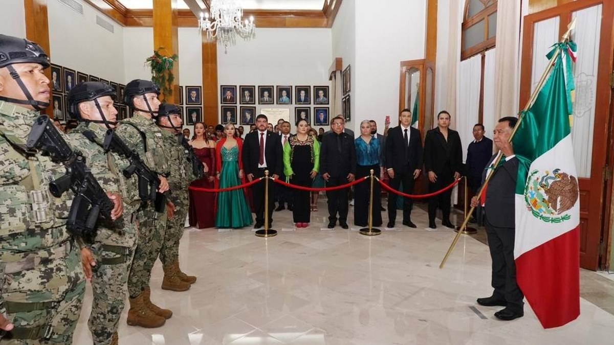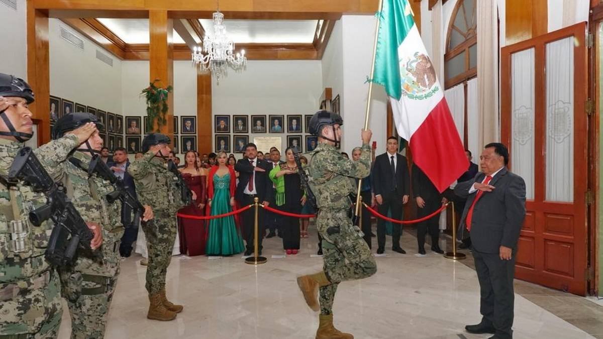 A las 11:10 de la noche, la primera autoridad hizo su arribo hacia el Salón Central para recibir la Bandera de México de manos de la escolta conformada por elementos de la Secretaría de Marina, acompañado de los toques de la banda de guerra “30 Caballeros”.