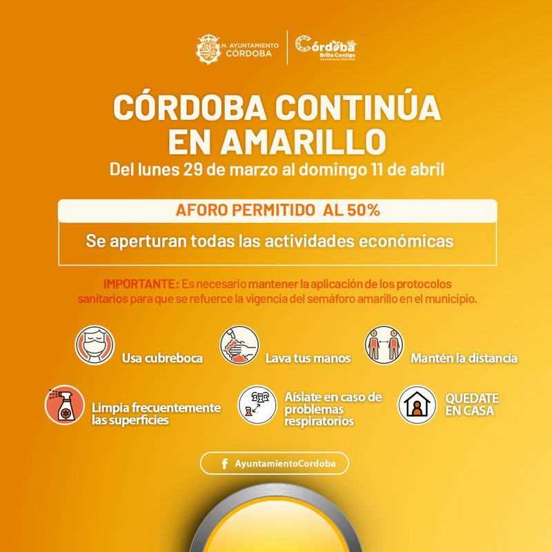 Del lunes 29 de marzo y hasta el próximo domingo 11 de abril, Córdoba se mantendrá en color amarillo del semáforo epidemiológico, informó el titular de la jefatura de salud municipal, Israel Alejandro Lara Gutiérrez.