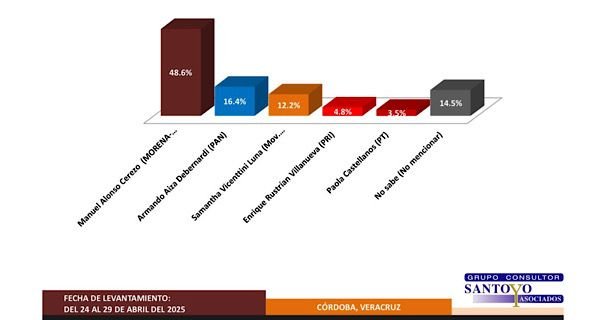 Córdoba, Veracruz.- El Candidato de Morena-PVEM a la Presidencia Municipal de Córdoba, Manuel Alonso Cerezo, arrancó la campaña con una amplia ventaja (de 3 a 1) sobre sus oponentes, contando con el 48.6% de la preferencia electoral de los cordobeses, según la encuesta realizada del 24 al 29 de abril por el Grupo Consultor Santoyo y Asociados.