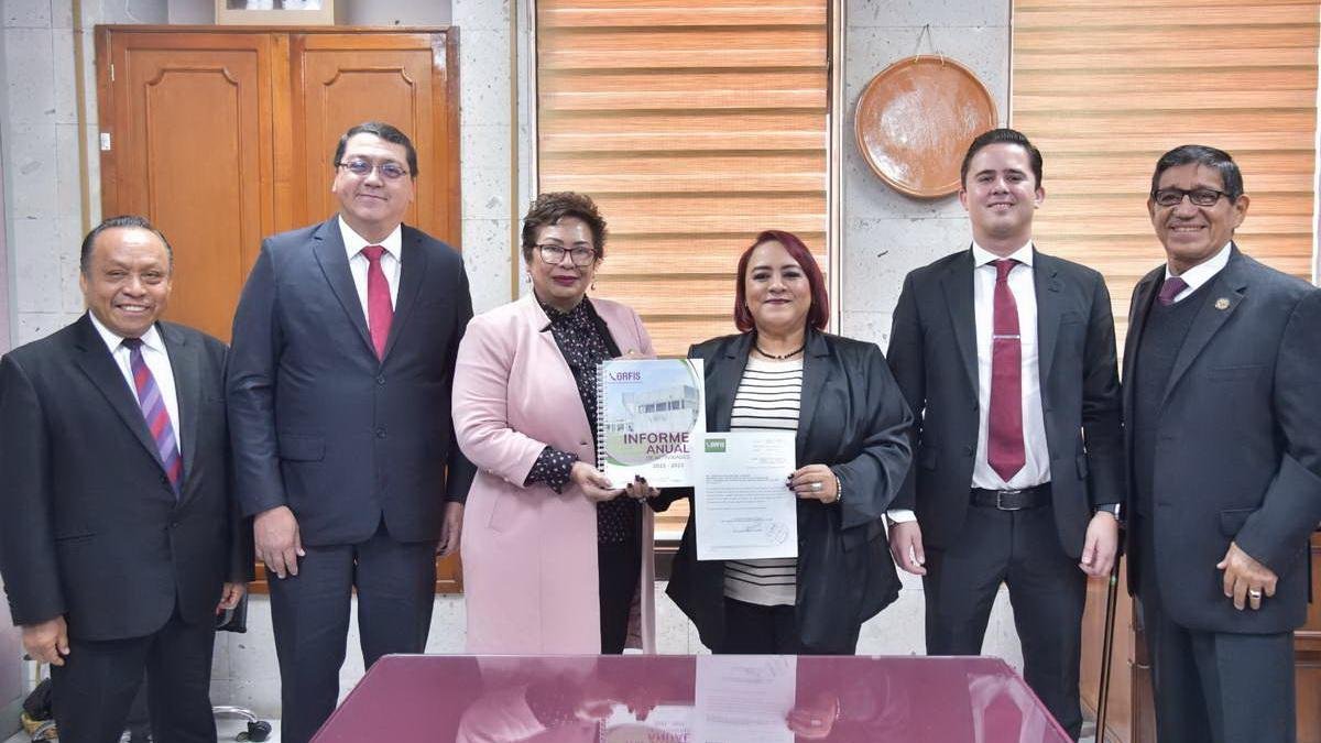 La presidenta de la Mesa Directiva de la LXVI Legislatura, diputada Adriana Esther Martínez Sánchez, recibió de la auditora general del Órgano de Fiscalización Superior del estado (Orfis), Delia González Cobos, el informe de labores 2022-2023 que incluye las actividades y principales acciones realizadas en materia de fiscalización superior del organismo autónomo.