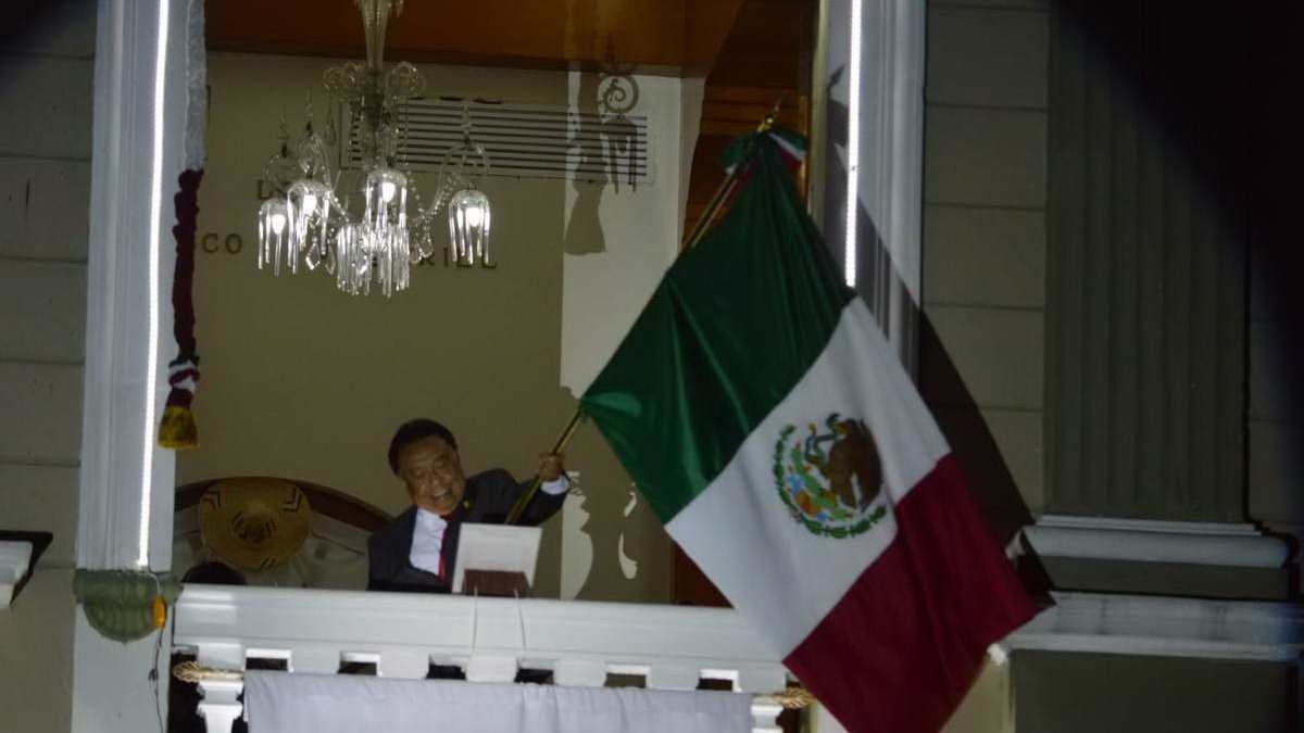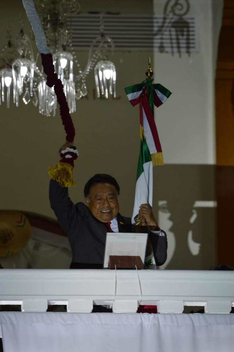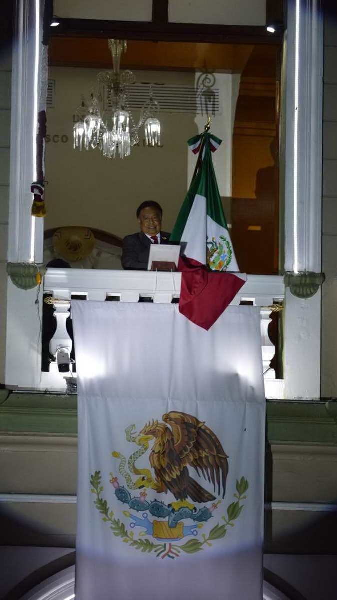 Desde el balcón principal del Palacio Municipal, a las 11:07 horas, el Presidente recibió al Lábaro Patrio por parte de la escolta de la Marina, así como entonó el Himno Nacional, posteriormente pronunció la histórica arenga que recuerda a los héroes que dieron patria y libertad, para después hondear la Bandera y tocar la campana que se escuchó al mismo tiempo que las de la Catedral de la Inmaculada Concepción.