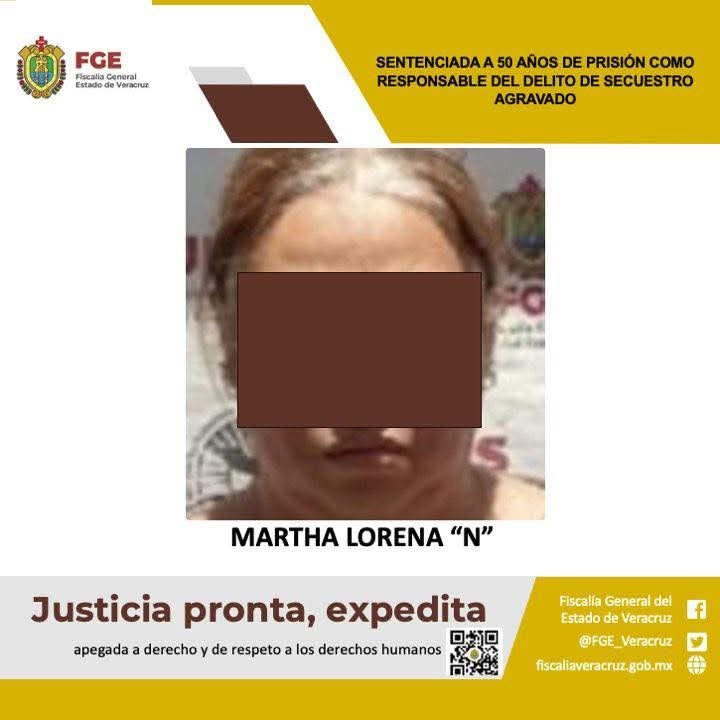 Córdoba, Ver.- Un juez de control de esta demarcación judicial dictó una sentencia condenatoria de 50 años de prisión contra Martha Lorena “N”, al ser encontrada penalmente responsable del delito de secuestro agravado, en perjuicio de la víctima identificada con las iniciales D.C.E.