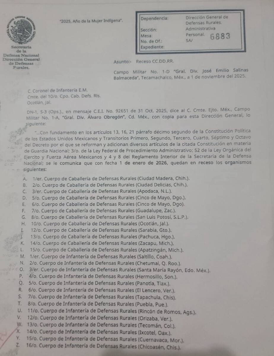 Orizaba, Ver.- A partir del 1 de enero de 2026, el 12º Cuerpo de Infantería de Fuerzas Rurales con sede en Orizaba entrará en un periodo de receso, al igual que los demás cuerpos rurales del país, esto de acuerdo con el comunicado oficial número 6883 emitido por la Secretaría de la Defensa Nacional (DEFENSA), una decisión que deja en el aire el futuro de más de 300 elementos y, sobre todo, de las comunidades que han dependido de su apoyo por décadas.