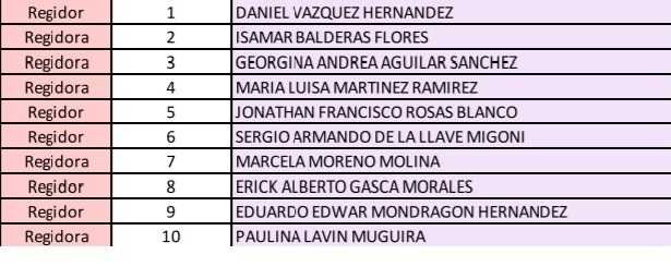 Los regidores propietarios confirmados por el OPLE son: Daniel Vázquez Hernández en la primera; Isamar Balderas Flores, segunda; Georgina Andrea Aguilar Sánchez, tercera; María Luisa Martínez Ramírez, cuarta, todas ellas correspondientes al partido político Morena.