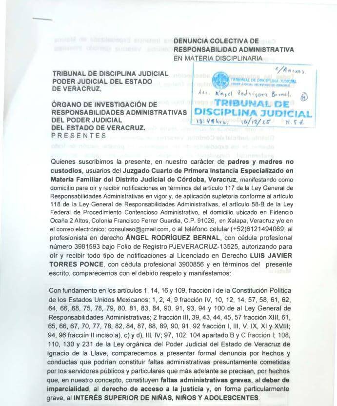 Xalapa, Veracruz.- Padres y madres no custodios del distrito judicial de Córdoba presentaron el pasado 10 de diciembre de 2025 una denuncia colectiva de responsabilidad administrativa ante el Tribunal de Disciplina Judicial del Poder Judicial del Estado de Veracruz, al advertir presuntas irregularidades procesales, prácticas de presión y actos de intimidación en juicios familiares que, de confirmarse, afectarían el debido proceso y el interés superior de niñas, niños y adolescentes.