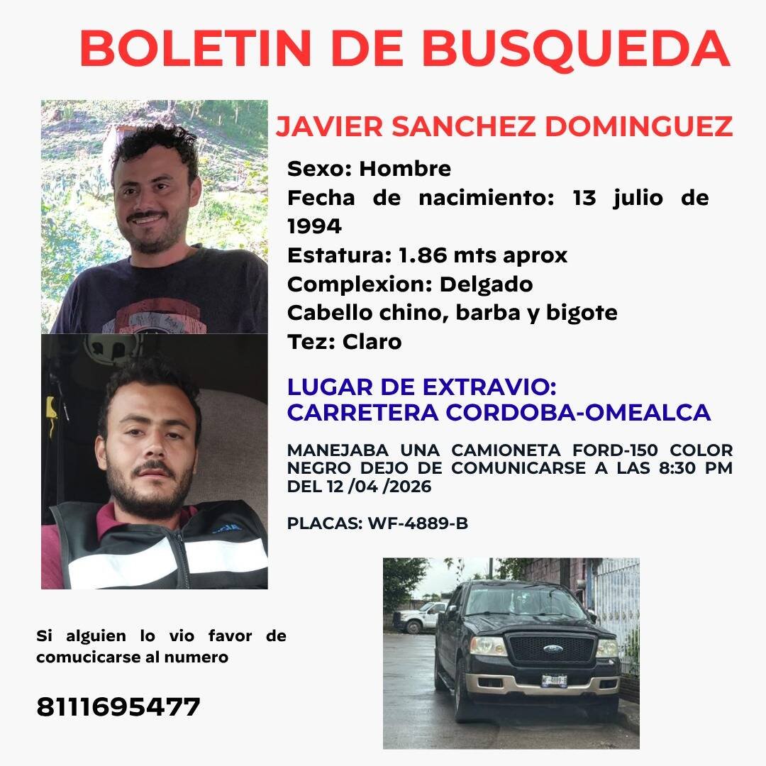 Región, Ver.— Un hombre identificado como Javier Sánchez Domínguez fue reportado como desaparecido luego de perder comunicación con sus familiares cuando circulaba sobre la carretera Córdoba–Omealca, la noche del pasado domingo 12 de abril.