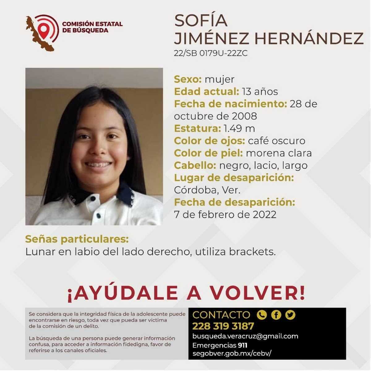 Córdoba, Ver. – Una menor de 13 años que responde al nombre de Sofía Jiménez Hernández es buscada intensamente por sus familiares y autoridades por lo que pidieron a la ciudadanía aportar datos sobre su ubicación.