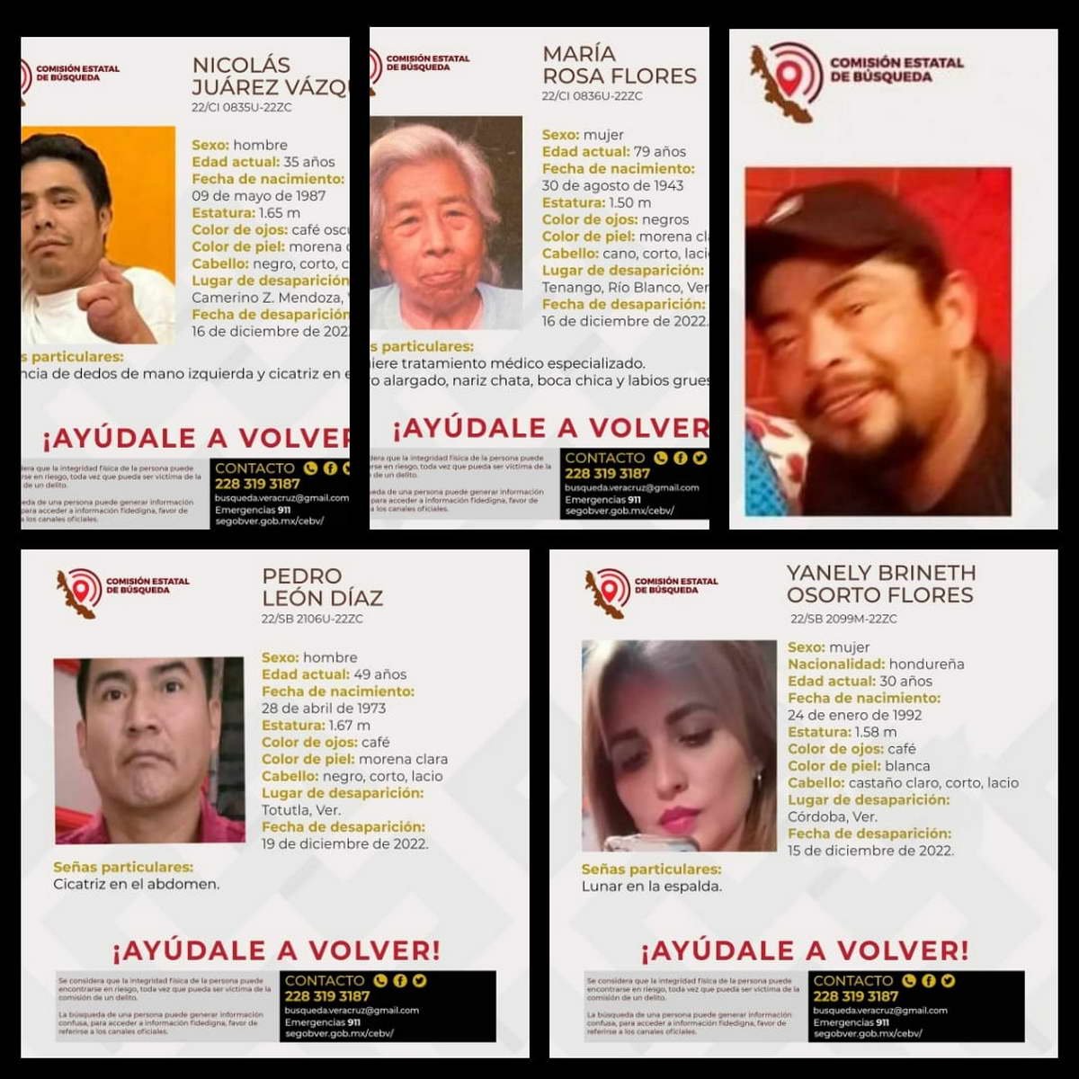 Tres hombres y dos mujeres originarios de los municipios de Totutla, Córdoba, Río Blanco, Camerino Z. Mendoza y Acultzingo, fueron reportados por sus familiares como desaparecidos debido a que no saben nada de ellos desde el 07 al 19 de diciembre del presente.