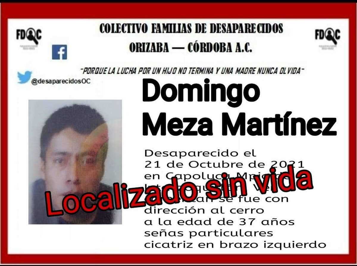 Ixtaczoquitlan Ver.-Domingo Meza Martínez quien estaba reportado como desaparecido desde el pasado día 21 de octubre del año en curso , fue hallado muerto en la cima del cerro de la congregación de Capoluca, la tarde de este lunes.