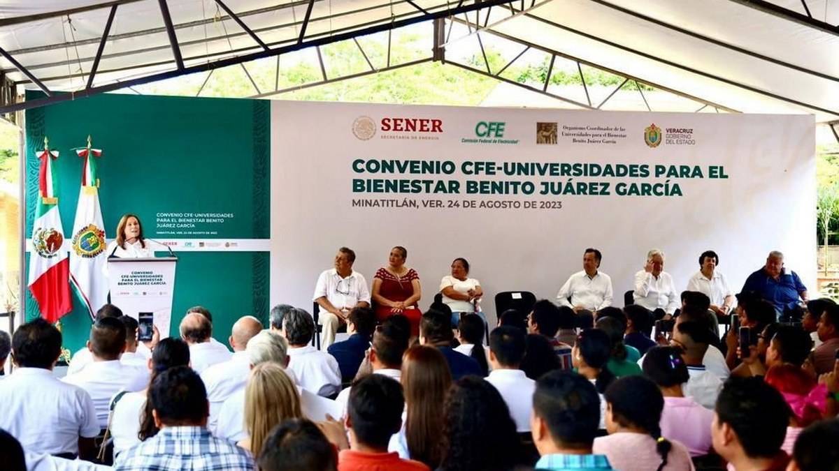 Fue el pasado jueves que la titular de la Secretaría de Energía también participó en la firma del Convenio CFE-Universidades para el Bienestar Benito Juárez García, en Minatitlán, Veracruz, en compañía del gobernador del Estado, Cuitláhuac García, y del director general de la Comisión Federal de electricidad (CFE), Manuel Bartlett.