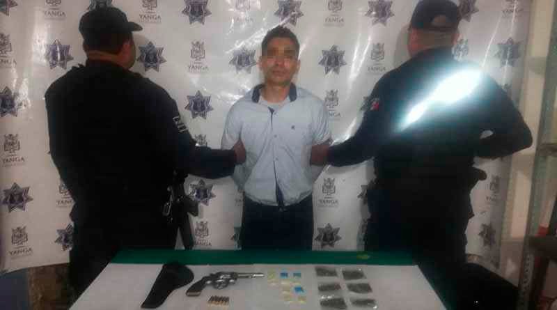 Yanga, Ver.- Un sujeto que supuestamente participó en el robo con violencia cometido en la sucursal de Banco Azteca de Yanga, fue intervenido por elementos de la Policía Municipal, luego de un reporte ciudadano, tenia en su posesión un arma de fuego, bolsas que contenían sustancias con características de la marihuana y cristal.