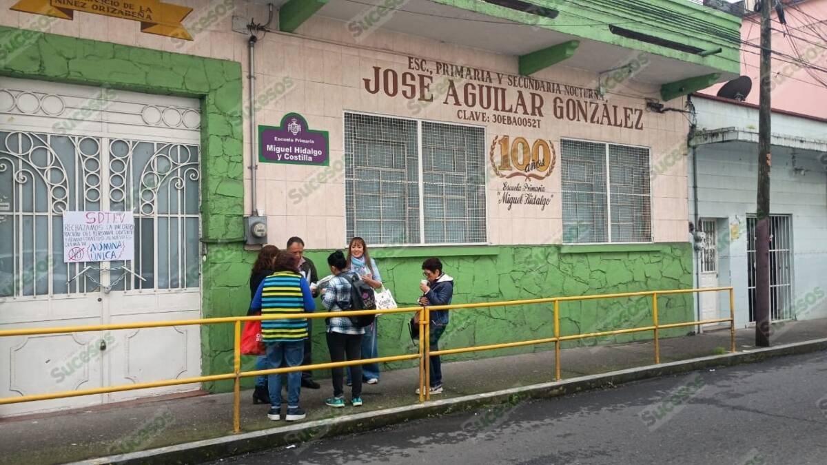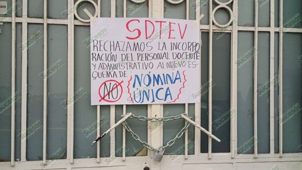 Orizaba, Ver.- Personal docente y administrativo afiliado al Sindicato Democrático de Trabajadores de la Educación de Veracruz (SDTEV) realizó este viernes una protesta pacífica en la primaria Miguel Hidalgo, donde colocaron un candado en la entrada del plantel y exhibieron cartulinas con mensajes de rechazo a la incorporación obligatoria a la nómina única bancaria que impulsa el Gobierno estatal.