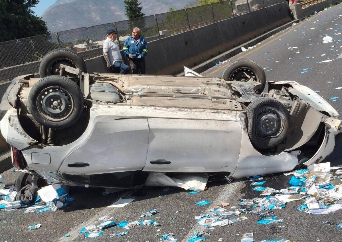 De acuerdo con los primeros reportes, el vehículo habría sido impactado por una camioneta tipo van, lo que ocasionó que el conductor perdiera el control de la unidad. En el lugar quedaron esparcidos materiales publicitarios, lo que complicó el tránsito en la zona.
