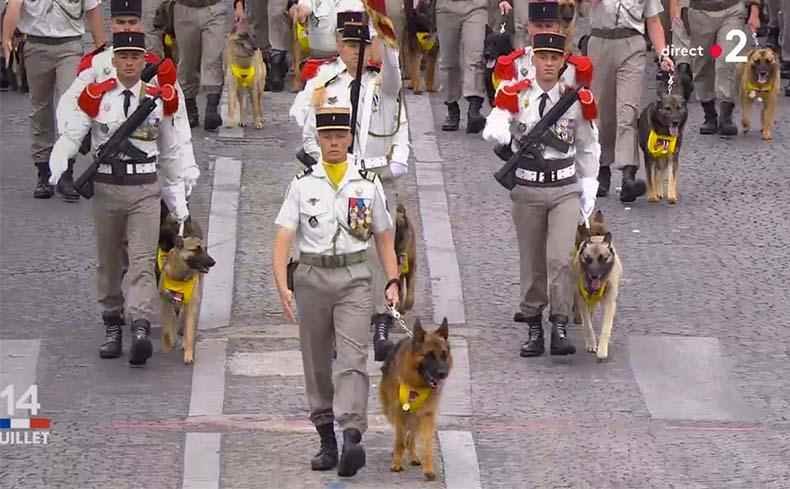 La patrulla de Francia, una escuadrilla de aviones que deja escapar humo con los colores de la bandera francesa abre el desfile, mientras que el final está marcado por la presencia del gobernador militar de París que saluda oficialmente al presidente de la República. Este día de fiesta termina por la noche con los magníficos fuegos artificiales alrededor de la torre Eiffel.