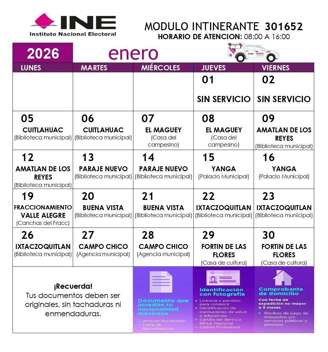 Luego del periodo de descanso del Instituto Nacional Electoral (INE), este mes se reactivaron los servicios del módulo itinerante del Registro Federal de Electores (RFE), siendo las fechas establecidas para el municipio de Fortín, los días jueves 29 y viernes 30 de enero del año en curso.